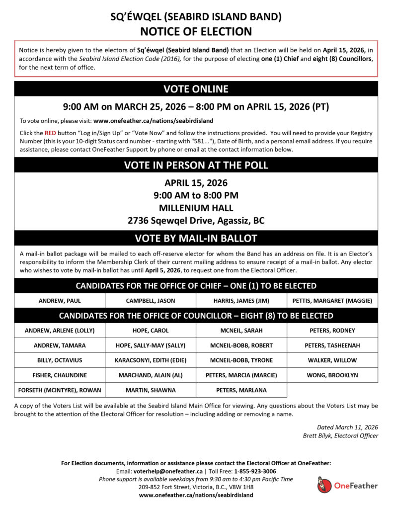 Please update your contact information and send to membership@seabirdisland.ca in order to receive election packages and more.